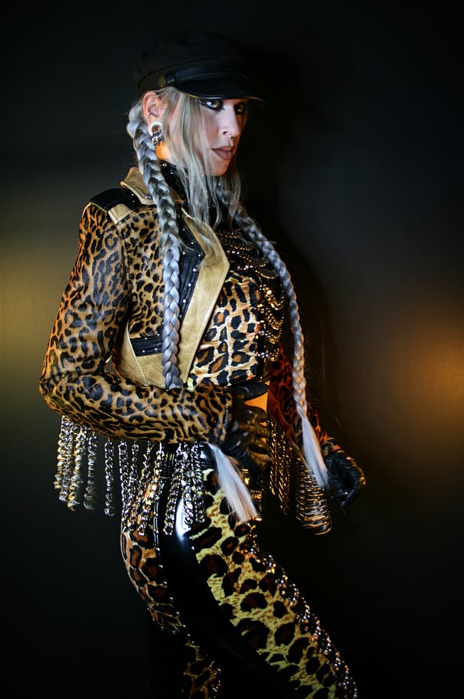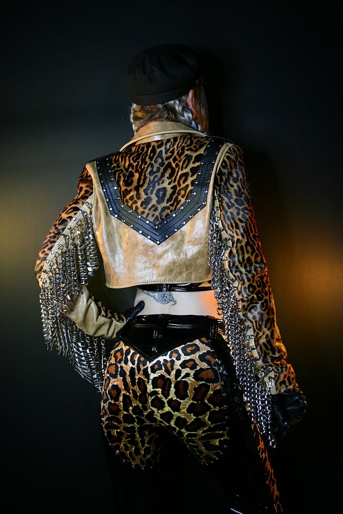 Made from scratch out of tan genuine leather, leopard hair on hide and black faux leather. Bolero cut and chains/metal detailing all over. Lined in black satin.